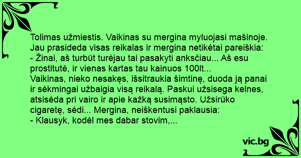 - Žinai, aš turbūt turėjau tai pasakyti anksčiau... Aš esu prostitutė, ir vienas kartas tau kainuos 100lt...