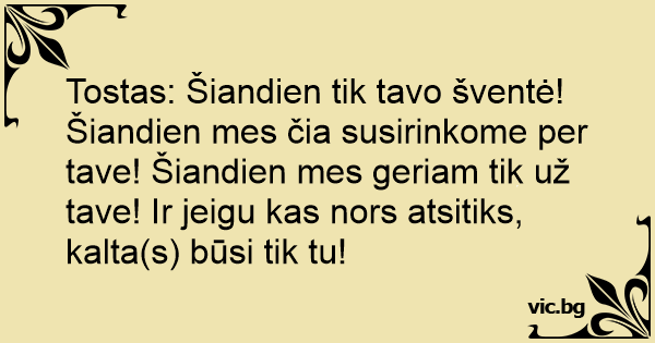 Tostas: Šiandien tik tavo šventė! Šiandien mes čia susirinkome per tave! Šiandien mes geriam tik už tave! Ir jeigu kas nors atsitiks, kalta(s) būsi tik tu!