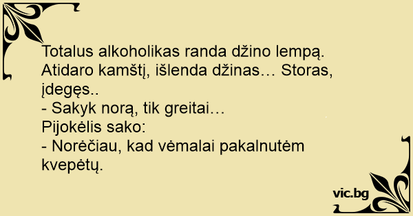 Totalus alkoholikas randa džino lempą. Atidaro kamštį, išlenda džinas… Storas, įdegęs..