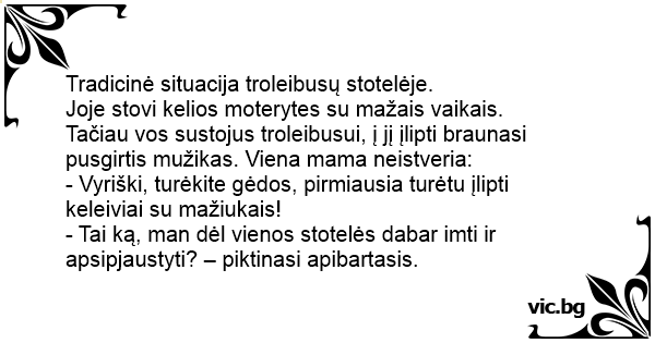 Tačiau vos sustojus troleibusui, į jį įlipti braunasi pusgirtis mužikas. Viena mama neistveria: