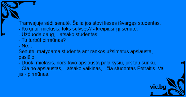 Tramvajuje sėdi senutė. Šalia jos stovi liesas išvargęs studentas.
