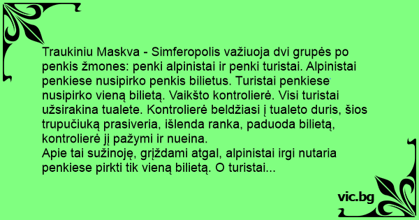 Traukiniu Maskva - Simferopolis važiuoja dvi grupės po penkis žmones: penki alpinistai ir penki turistai. Alpinistai penkiese nusipirko penkis bilietus. Turistai penkiese nusipirko vieną bilietą. Vaikšto kontrolierė. Visi turistai užsirakina tualete. Kontrolierė beldžiasi į tualeto duris, šios trupučiuką prasiveria, išlenda ranka, paduoda bilietą, kontrolierė jį pažymi ir nueina.