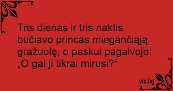 Tris dienas ir tris naktis bučiavo princas miegančiąją gražuolę, o paskui pagalvojo: „O gal ji tikrai mirusi?“