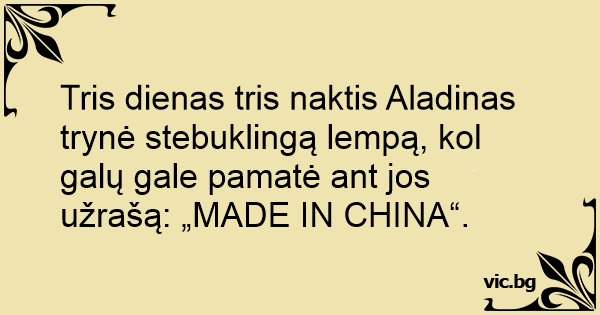 Tris dienas tris naktis Aladinas trynė stebuklingą lempą, kol galų gale pamatė ant jos užrašą: „MADE IN CHINA“.