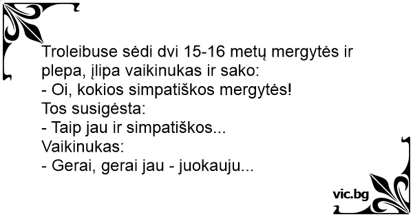 Troleibuse sėdi dvi 15-16 metų mergytės ir plepa, įlipa vaikinukas ir sako: