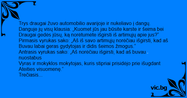 Pirmasis vyrukas sako: „Aš iš savo artimųjų norėčiau išgirsti, kad aš