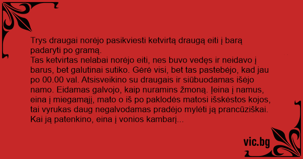Tas ketvirtas nelabai norėjo eiti, nes buvo vedęs ir neidavo į barus, bet galutinai sutiko. Gėrė visi, bet tas pastebėjo, kad jau po 00.00 val. Atsisveikino su draugais ir siūbuodamas išėjo namo. Eidamas galvojo, kaip nuramins žmoną. Įeina į namus, eina į miegamąjį, mato o iš po paklodės matosi išskėstos kojos, tai vyrukas daug negalvodamas pradėjo mylėti ją prancūziškai. Kai ją patenkino, eina į vonios kambarį apiprausti fejsą. Žiūri – o ten ant klozeto sėdi jo žmona.