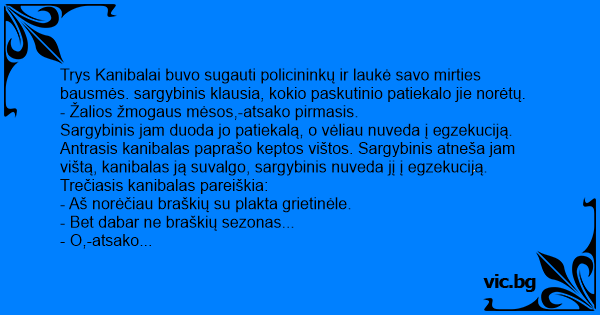 Trys Kanibalai buvo sugauti policininkų ir laukė savo mirties bausmės. sargybinis klausia, kokio paskutinio patiekalo jie norėtų.