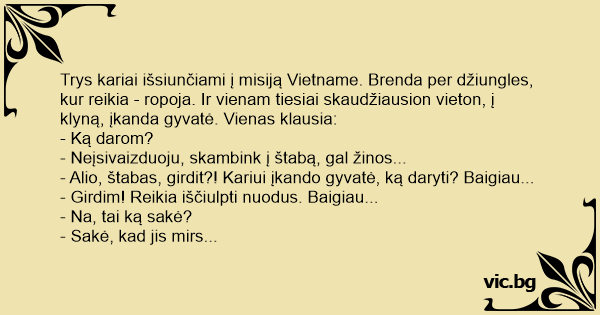- Alio, štabas, girdit?! Kariui įkando gyvatė, ką daryti? Baigiau...