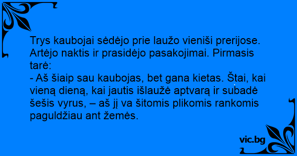 - Aš šiaip sau kaubojas, bet gana kietas. Štai, kai vieną dieną, kai jautis išlaužė aptvarą ir subadė šešis vyrus, – aš jį va šitomis plikomis rankomis paguldžiau ant žemės.