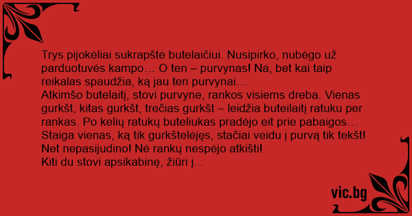 Trys pijokėliai sukrapštė butelaičiui. Nusipirko, nubėgo už parduotuvės kampo… O ten – purvynas! Na, bet kai taip reikalas spaudžia, ką jau ten purvynai…