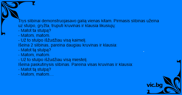 Išeina 2 slibinas, pareina daugiau kruvinas ir klausia: