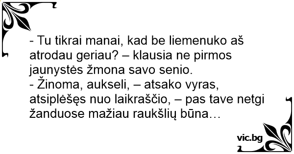 - Tu tikrai manai, kad be liemenuko aš atrodau geriau? – klausia ne pirmos jaunystės žmona savo senio.