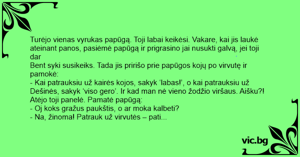- Na, žinoma! Patrauk už virvutės – pati išgirsi. Toji patraukė. Papūga nenoriai išstenėjo: