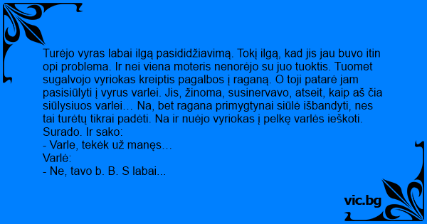 Turėjo vyras labai ilgą pasididžiavimą. Tokį ilgą, kad jis jau buvo itin opi problema. Ir nei viena moteris nenorėjo su juo tuoktis. Tuomet sugalvojo vyriokas kreiptis pagalbos į raganą. O toji patarė jam pasisiūlyti į vyrus varlei. Jis, žinoma, susinervavo, atseit, kaip aš čia siūlysiuos varlei… Na, bet ragana primygtynai siūlė išbandyti, nes tai turėtų tikrai padėti. Na ir nuėjo vyriokas į pelkę varlės ieškoti. Surado. Ir sako: