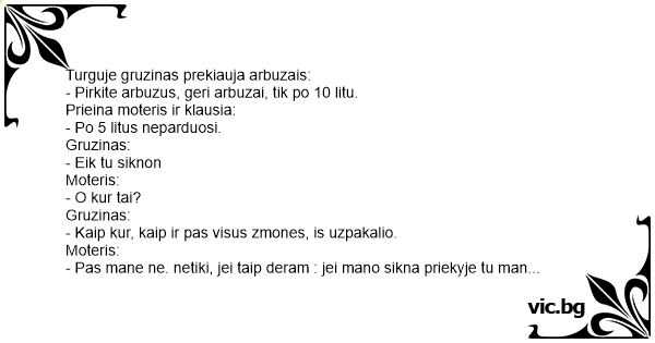 - Pas mane ne. netiki, jei taip deram : jei mano sikna priekyje tu man parduosi 10 kilogramu arbuzu po 1 lita!