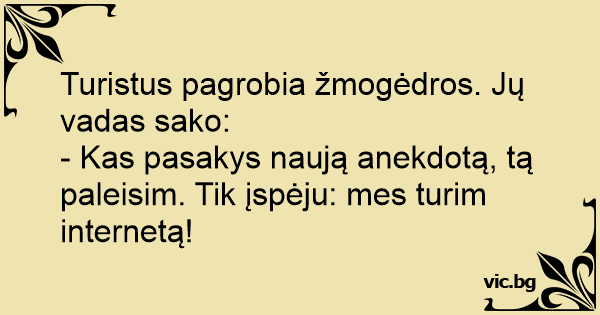 - Kas pasakys naują anekdotą, tą paleisim. Tik įspėju: mes turim internetą!
