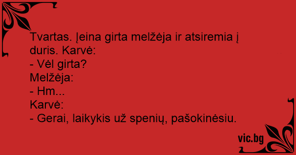 Tvartas. Įeina girta melžėja ir atsiremia į duris. Karvė: