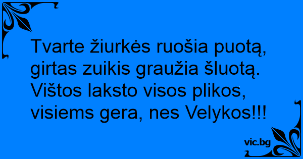 Tvarte žiurkės ruošia puotą, girtas zuikis graužia šluotą. Vištos laksto visos plikos, visiems gera, nes Velykos!!!