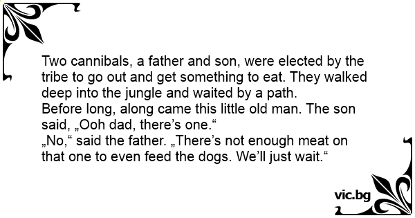 Two cannibals, a father and son, were elected by the tribe to go out and get something to eat. They walked deep into the jungle and waited by a path.