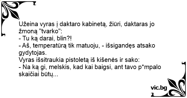 Užeina vyras į daktaro kabinetą, žiūri, daktaras jo žmoną "tvarko":