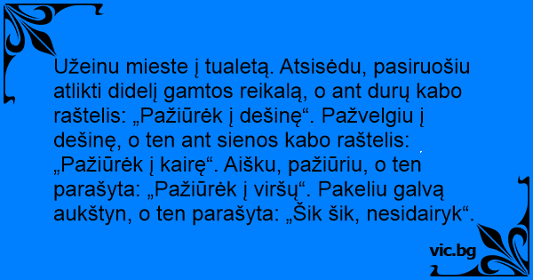 Užeinu mieste į tualetą. Atsisėdu, pasiruošiu atlikti didelį gamtos reikalą, o ant durų kabo raštelis: „Pažiūrėk į dešinę“. Pažvelgiu į dešinę, o ten ant sienos kabo raštelis: „Pažiūrėk į kairę“. Aišku, pažiūriu, o ten parašyta: „Pažiūrėk į viršų“. Pakeliu galvą aukštyn, o ten parašyta: „Šik šik, nesidairyk“.