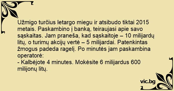 Užmigo turčius letargo miegu ir atsibudo tiktai 2015 metais. Paskambino į banką, teiraujasi apie savo sąskaitas. Jam praneša, kad sąskaitoje – 10 milijardų litų, o turimų akcijų vertė – 5 milijardai. Patenkintas žmogus padeda ragelį. Po minutės jam paskambina operatorė: