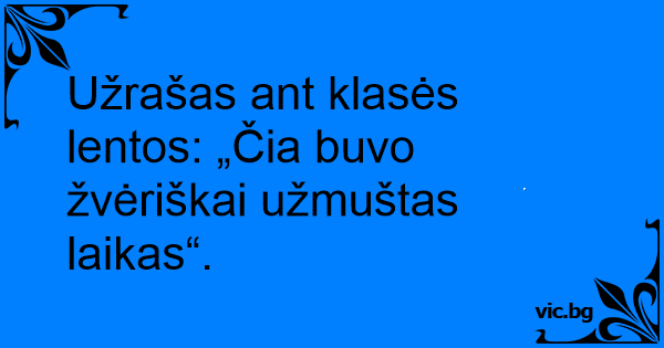 Užrašas ant klasės lentos: „Čia buvo žvėriškai užmuštas laikas“.