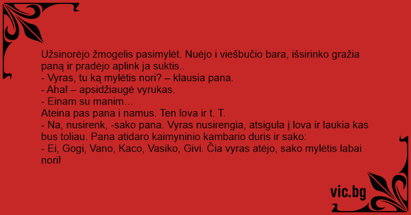 - Na, nusirenk, -sako pana. Vyras nusirengia, atsigula į lova ir laukia kas bus toliau. Pana atidaro kaimyninio kambario duris ir sako: