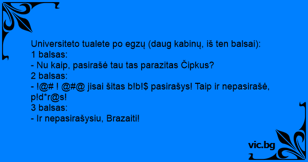 Universiteto tualete po egzų (daug kabinų, iš ten balsai):