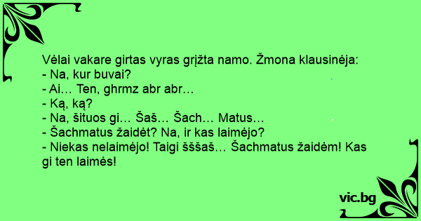 - Niekas nelaimėjo! Taigi šššaš… Šachmatus žaidėm! Kas gi ten laimės!