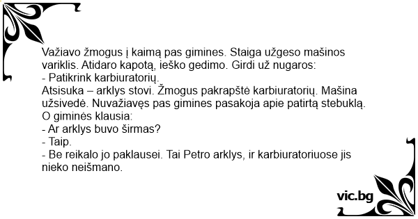 Važiavo žmogus į kaimą pas gimines. Staiga užgeso mašinos variklis. Atidaro kapotą, ieško gedimo. Girdi už nugaros: