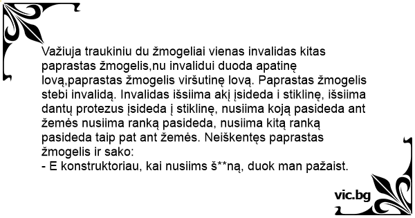 Važiuja traukiniu du žmogeliai vienas invalidas kitas paprastas žmogelis,nu invalidui duoda apatinę lovą,paprastas žmogelis viršutinę lovą. Paprastas žmogelis stebi invalidą. Invalidas išsiima akį įsideda i stiklinę, išsiima dantų protezus įsideda į stiklinę, nusiima koją pasideda ant žemės nusiima ranką pasideda, nusiima kitą ranką pasideda taip pat ant žemės. Neiškentęs paprastas žmogelis ir sako: