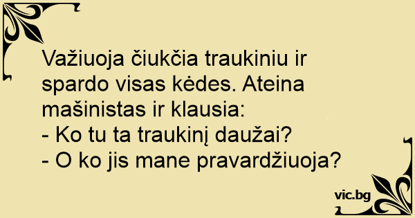 Važiuoja čiukčia traukiniu ir spardo visas kėdes. Ateina mašinistas ir klausia:
