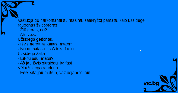 Važiuoja du narkomanai su mašina, sankryžoj pamatė, kaip užsidegė raudonas šviesoforas: