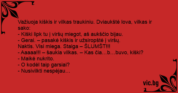 - Aaaaa!!! – šaukia vilkas. – Kas čia…b…buvo, kiški?