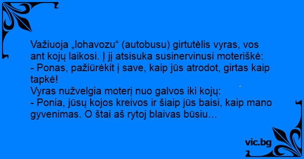 Važiuoja „lohavozu“ (autobusu) girtutėlis vyras, vos ant kojų laikosi. Į jį atsisuka susinervinusi moteriškė: