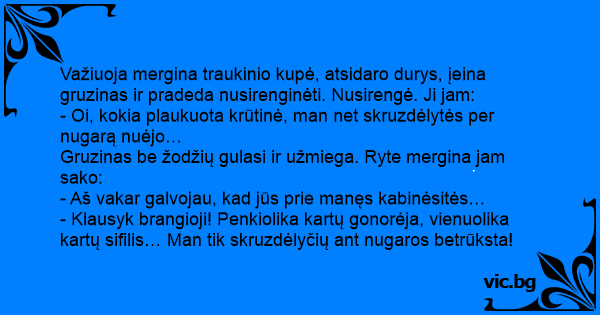 Važiuoja mergina traukinio kupė, atsidaro durys, įeina gruzinas ir pradeda nusirenginėti. Nusirengė. Ji jam: