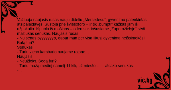 Važiuoja naujasis rusas nauju dideliu „Mersedesu“, gyvenimu patenkintas, atsipalaidavęs. Sustoja prie šviesoforo – ir tik „bumpt!“ kažkas jam iš užpakalio. Išpuola iš mašinos – o ten sukriošusiame „Zaporožietyje“ sėdi mažiukas senukas. Naujasis rusas: