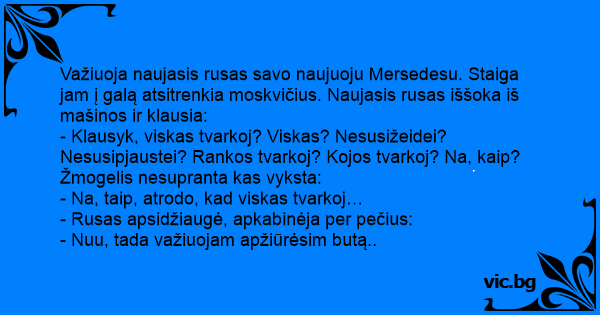Važiuoja naujasis rusas savo naujuoju Mersedesu. Staiga jam į galą atsitrenkia moskvičius. Naujasis rusas iššoka iš mašinos ir klausia: