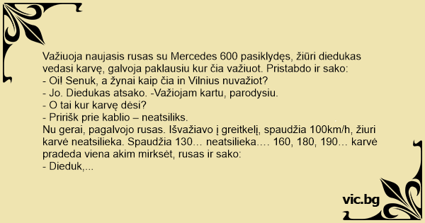 Važiuoja naujasis rusas su Mercedes 600 pasiklydęs, žiūri diedukas vedasi karvę, galvoja paklausiu kur čia važiuot. Pristabdo ir sako: