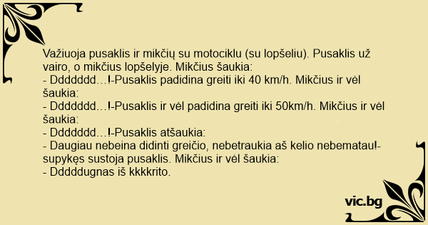 - Ddddddd…!-Pusaklis ir vėl padidina greiti iki 50km/h. Mikčius ir vėl šaukia: