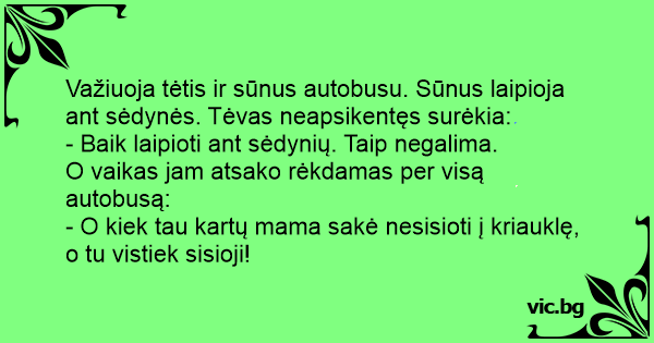 Važiuoja tėtis ir sūnus autobusu. Sūnus laipioja ant sėdynės. Tėvas neapsikentęs surėkia:
