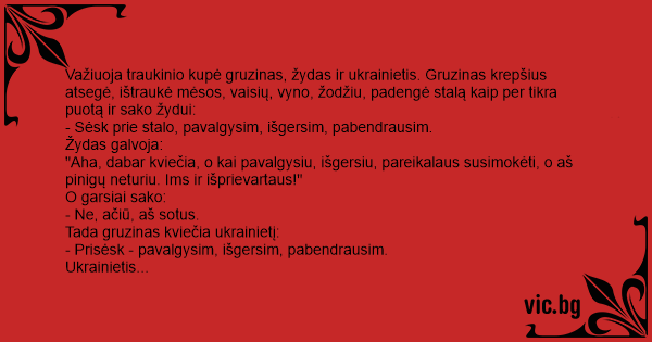 Važiuoja traukinio kupė gruzinas, žydas ir ukrainietis. Gruzinas krepšius atsegė, ištraukė mėsos, vaisių, vyno, žodžiu, padengė stalą kaip per tikra puotą ir sako žydui: