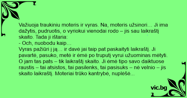 Važiuoja traukiniu moteris ir vyras. Na, moteris užsinori… Ji ima dažytis, pudruotis, o vyriokui vienodai rodo – jis sau laikraštį skaito. Tada ji ištaria: