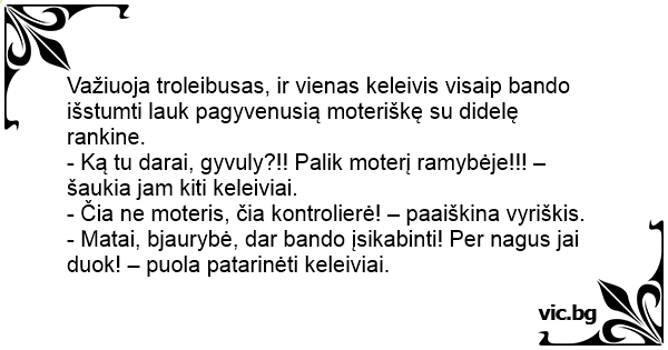 Važiuoja troleibusas, ir vienas keleivis visaip bando išstumti lauk pagyvenusią moteriškę su didelę rankine.