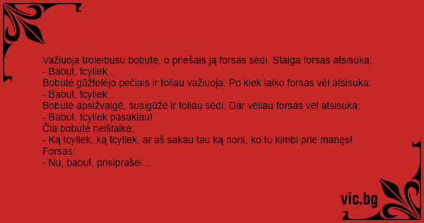 Važiuoja troleibusu bobutė, o priešais ją forsas sėdi. Staiga forsas atsisuka:
