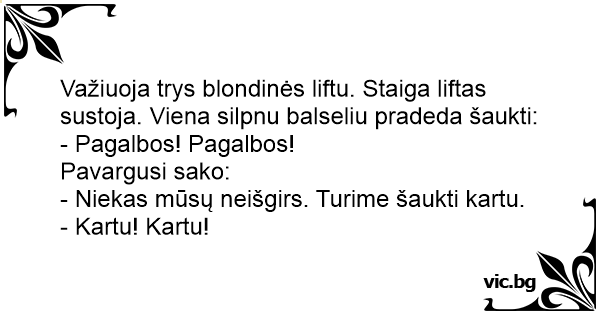 Važiuoja trys blondinės liftu. Staiga liftas sustoja. Viena silpnu balseliu pradeda šaukti: