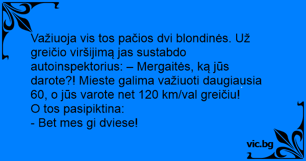 Važiuoja vis tos pačios dvi blondinės. Už greičio viršijimą jas sustabdo autoinspektorius: – Mergaitės, ką jūs darote?! Mieste galima važiuoti daugiausia 60, o jūs varote net 120 km/val greičiu!