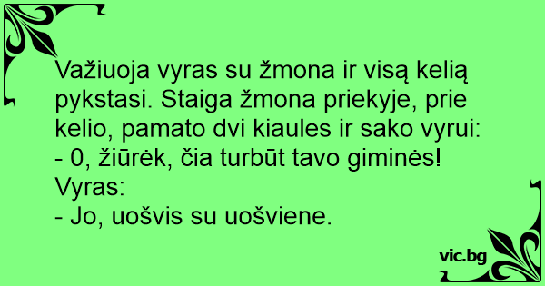 Чоловік із дружиною їдуть на машині й сваряться. Проїжджають через одне село і раптом бачать пару свиней. Дружина: — Твої родичі? — Ага, теща з тестем.